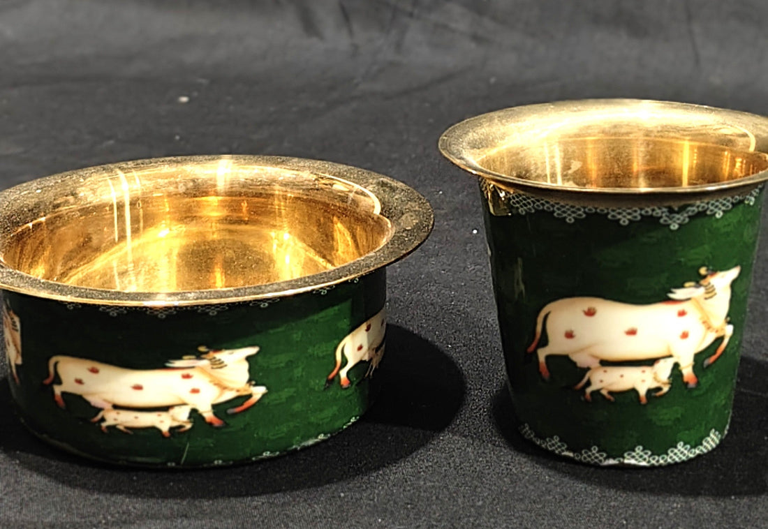 COFFEE / TEA DABRA SET PURE BRASS WITH GREEN PICHWAI DESIGN