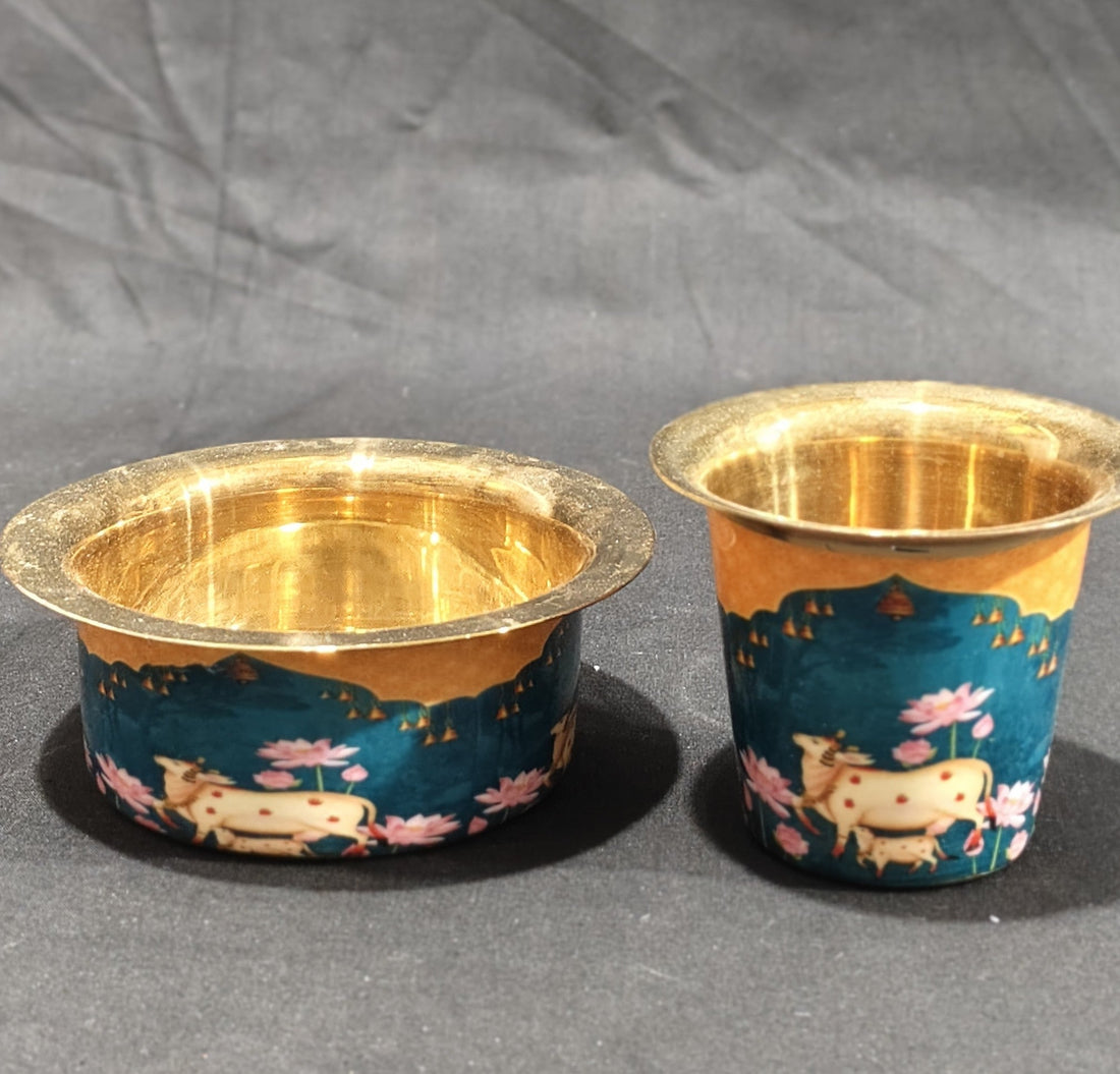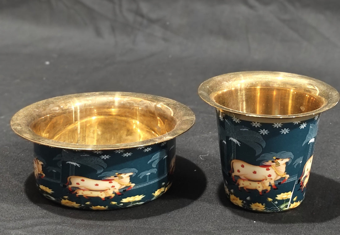 COFFEE / TEA DABRA SET PURE BRASS WITH GREYISH BLUE PICHWAI DESIGN