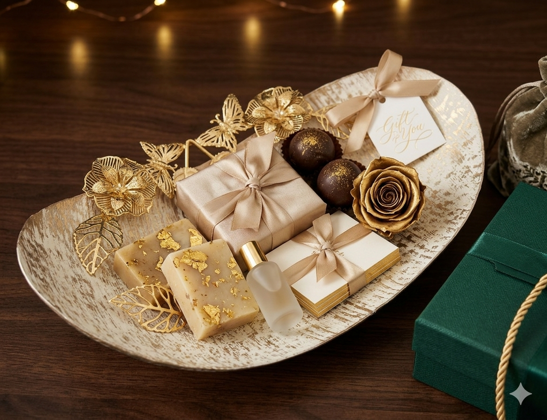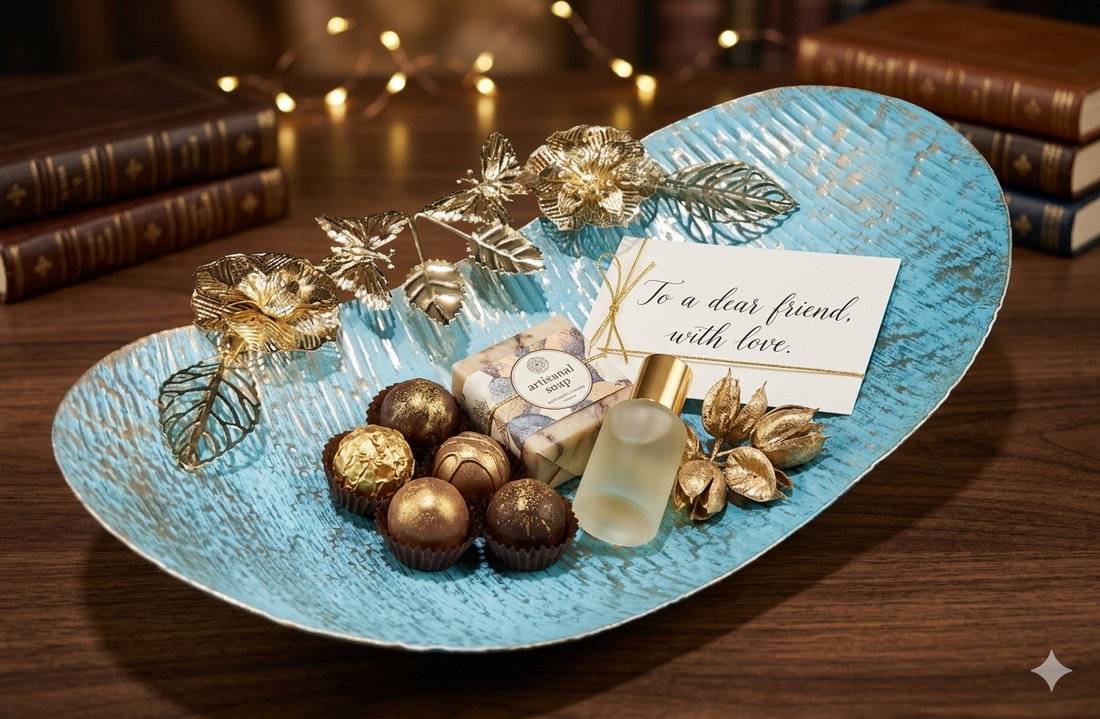 BOAT BASKET WITH GOLDEN BROOCH Gifting Plate (12" x 8") Elevate the Art of Gifting...
