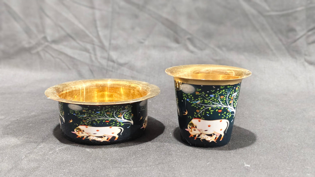 COFFEE / TEA DABRA SET PURE BRASS WITH GREYISH BLUE PICHWAI DESIGN