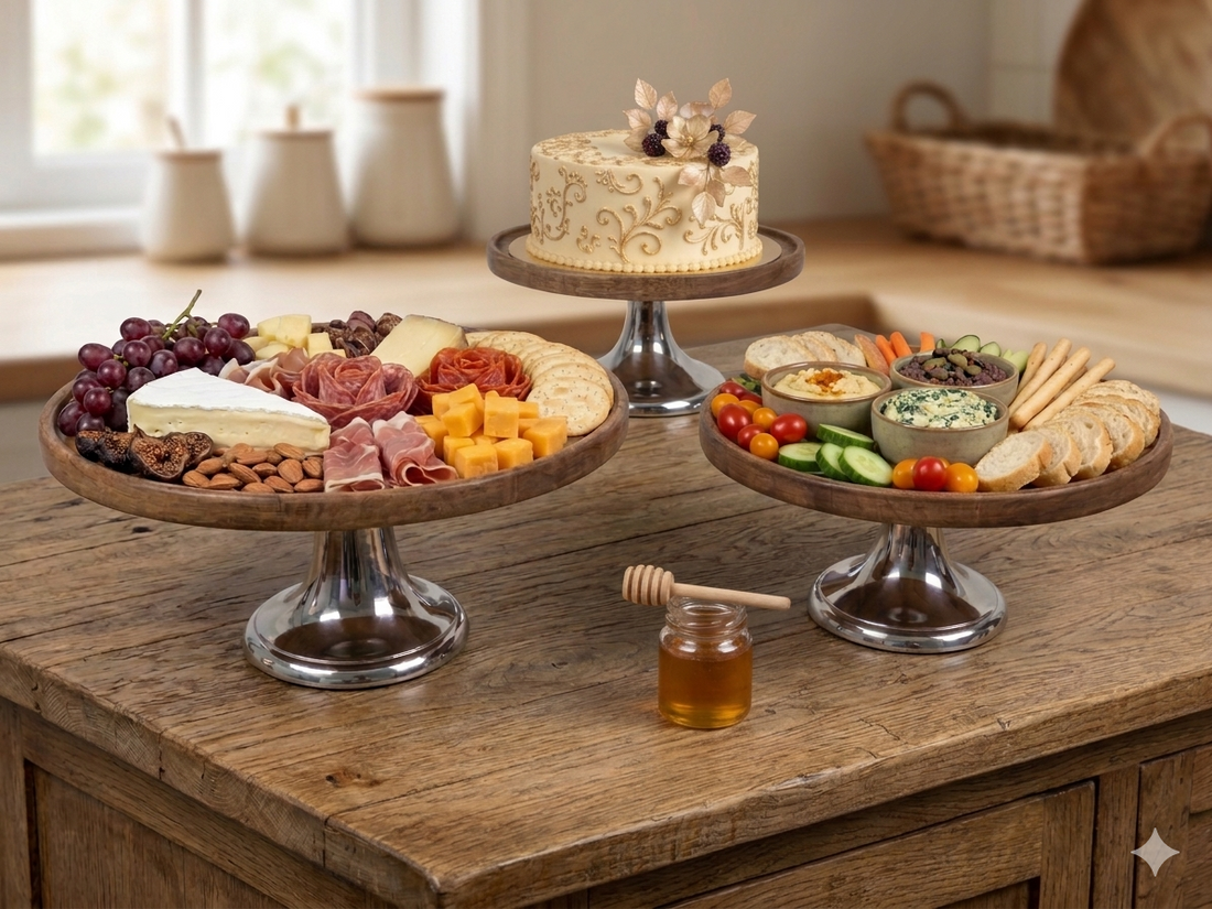 Cake Stand mango wood top and premium silver metal base This premium decorative product is...