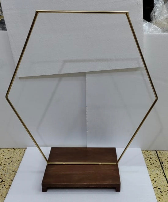 Featuring a 23" hexagonal wooden hoop elegantly mounted on a sturdy 10"x12" rectangular base, this stand is perfect for showcasing cakes, floral arrangements, or decorative accents. Its natural wood finish and geometric shape add warmth and sophistication to weddings, events, or home décor.