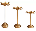 Inspired by the sacred lotus flower, each stand in this trio showcases delicately layered petals cradling a clear glass T-light holder. Designed in varying heights, the set creates a harmonious visual flow—perfect for altars, festive decor, or sophisticated centerpieces.